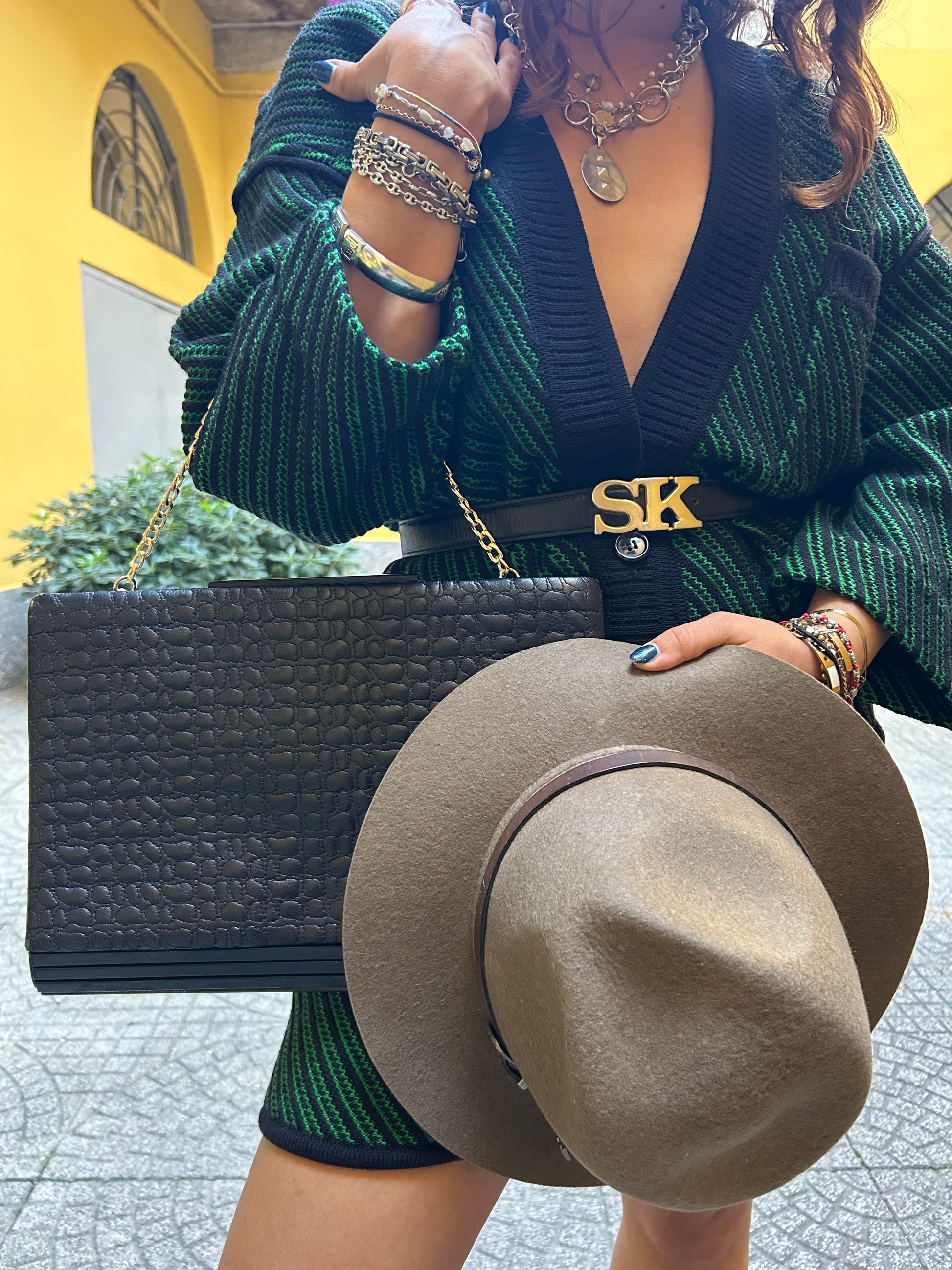 Realizzato in lana merinos,con cinturino in cuoio e fibbia metallica.