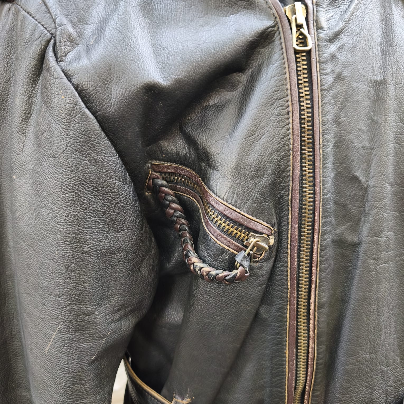 Biker in pelle vintage con trecce sulle spalle e come rifinatura sulle tasche.
