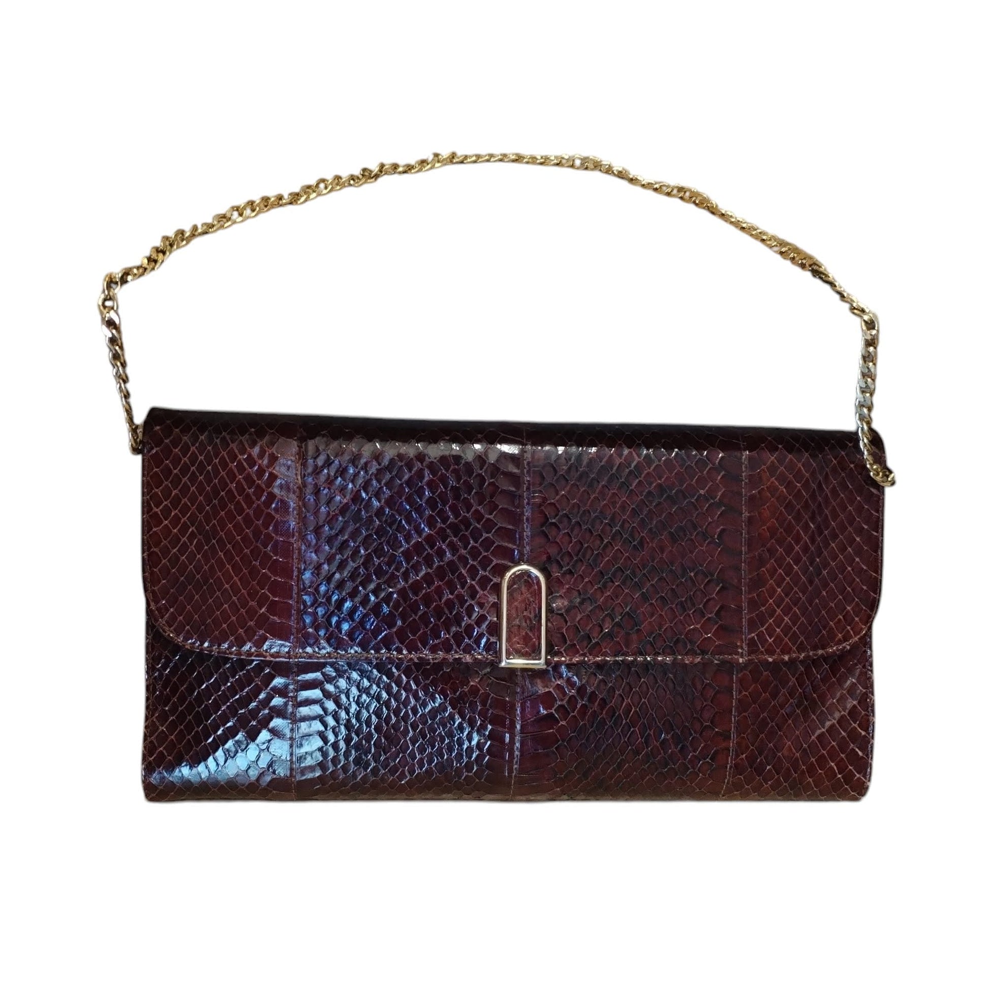 Una borsa che racchiude in sé l'eleganza e la raffinatezza della pelle di pitone. Realizzata in un caldo marrone, questa borsa a tracolla è un vero e proprio gioiello di pelletteria, perfetta per le donne che amano lo stile classico e ricercato.