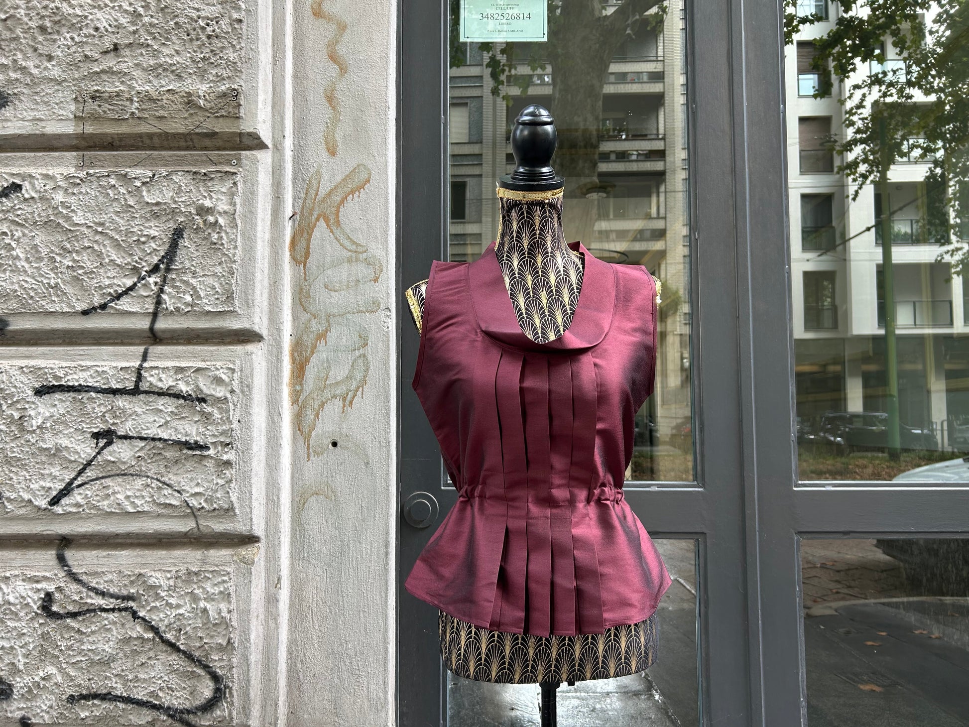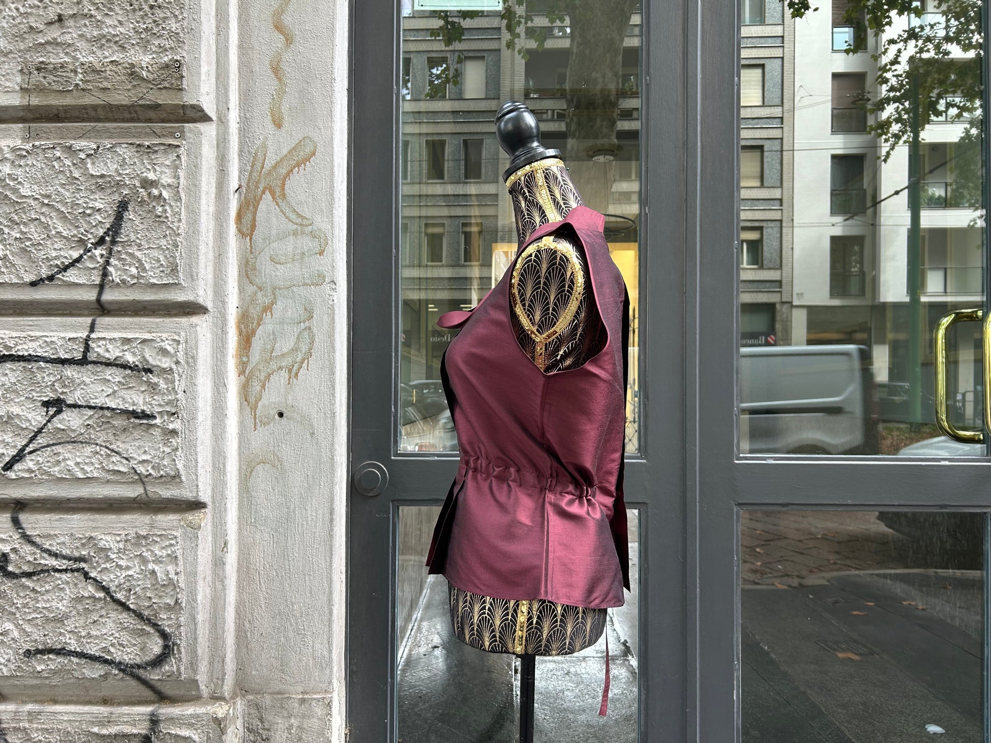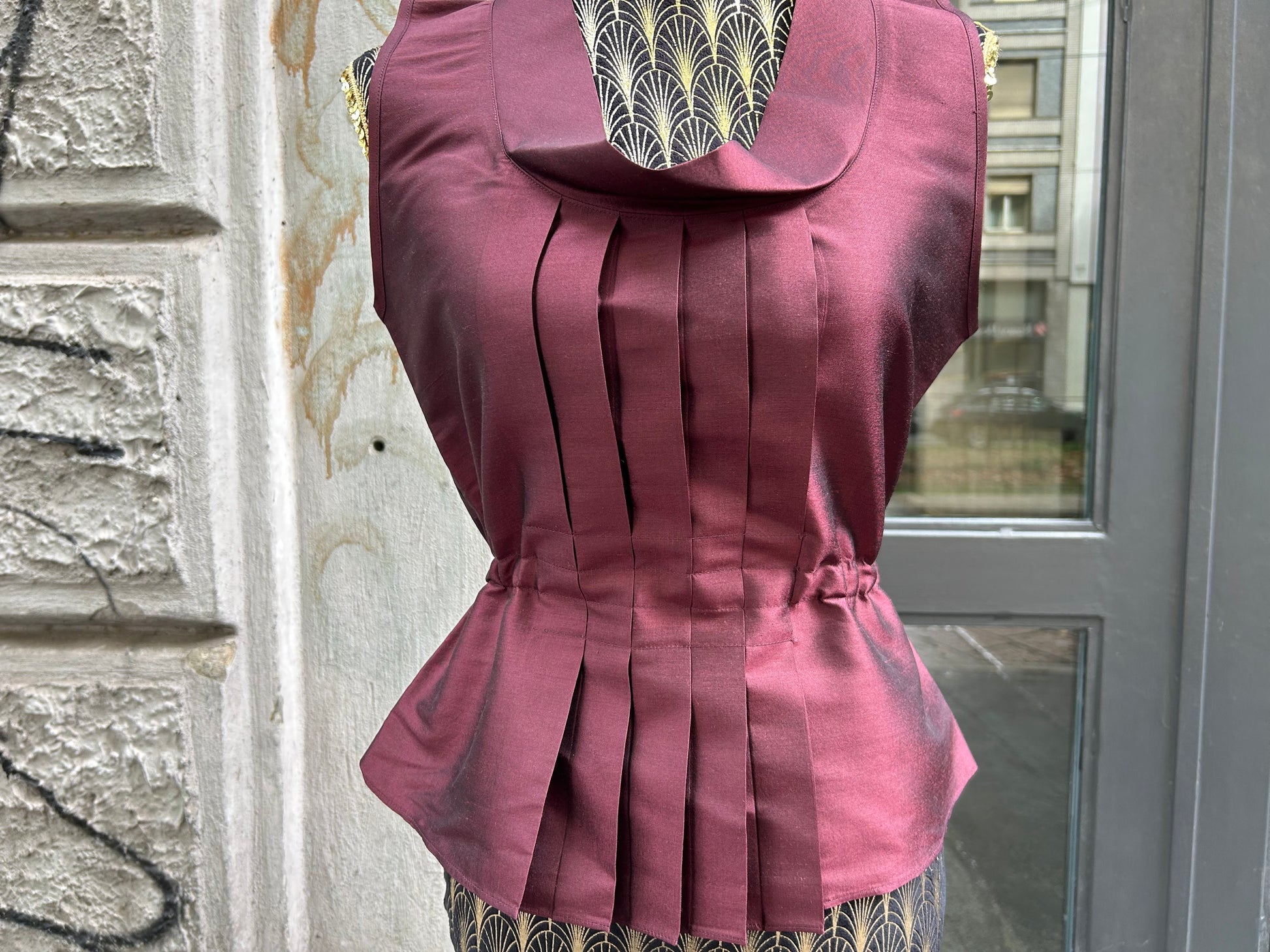 Un gilet in shantang di seta con allacciatura posteriore e coulisse in vita.