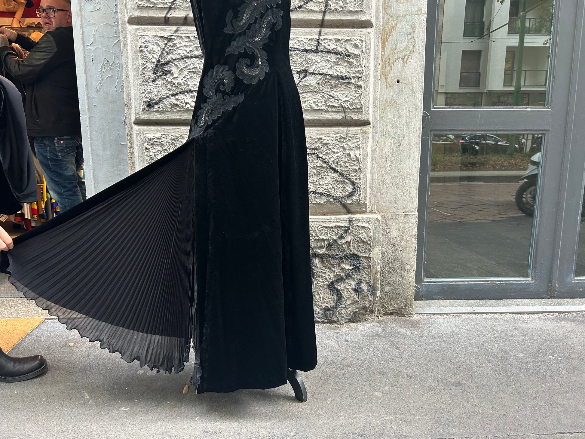 Un abito vintage favoloso,realizzato in velluto,con ricamo di pailletes sul corpetto.