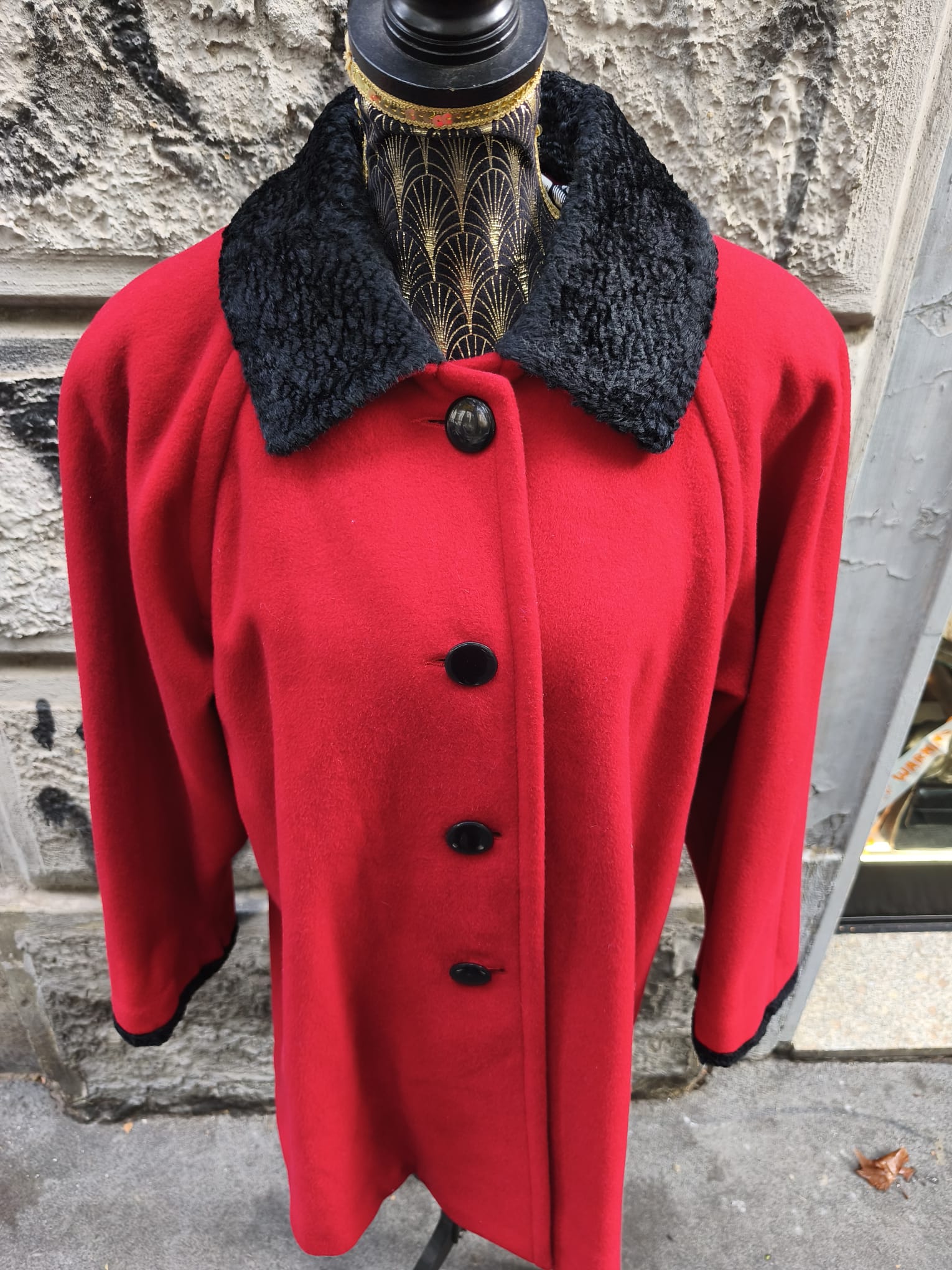 Cappotto donna vintage rosso con collo in Astrakan in pura lana