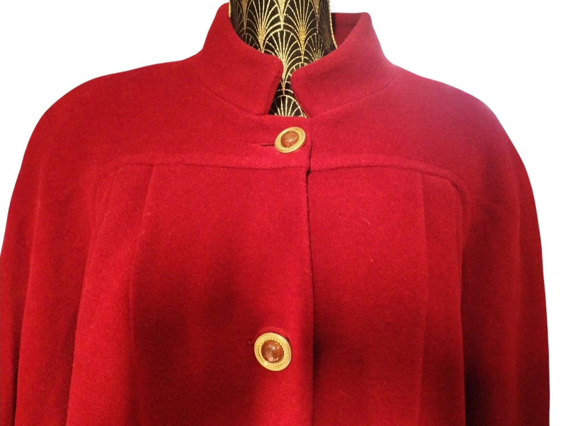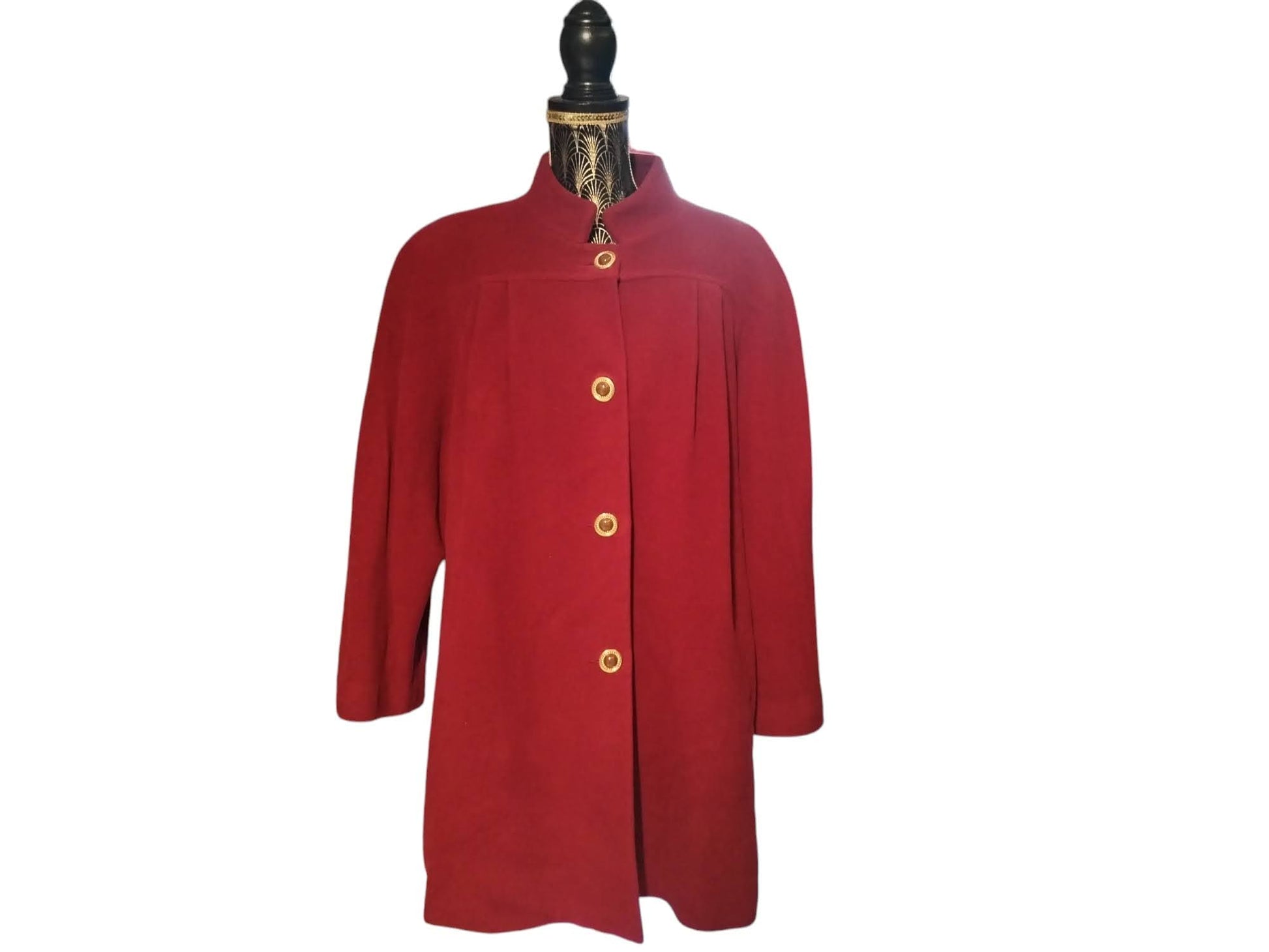 Un capospalla che racchiude in sé lo spirito audace e vibrante degli anni Ottanta. Questo cappotto rosso amaranto, un colore profondo e intenso, è un vero e proprio pezzo da collezione. La sua linea dritta e pulita gli conferisce un'eleganza senza tempo, mentre i quattro bottoni dorati originali, luccicanti come monete d'oro, ne sottolineano il carattere prezioso.