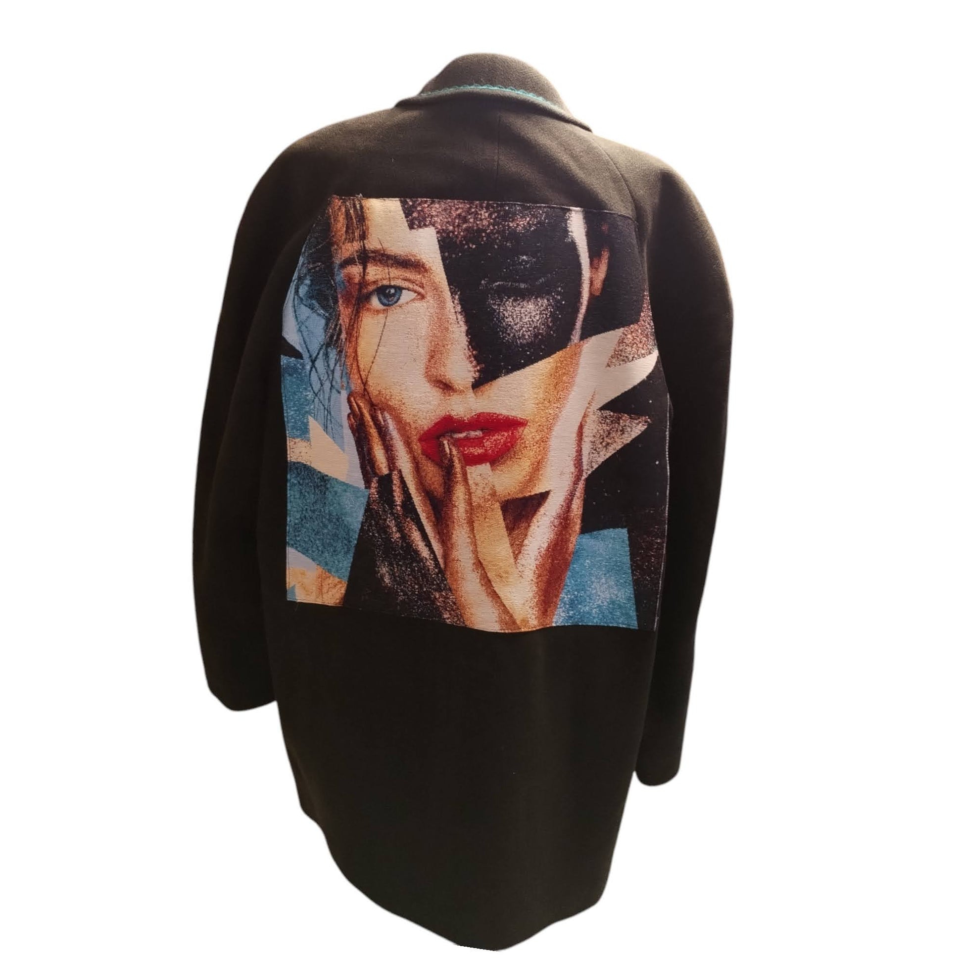 Ma la vera particolarità di questo capo sta nel dettaglio applicato al centro della schiena, proprio tra le spalle. Qui, è stata cucita una porzione di stoffa da tappezzeria, un tessuto più rigido e strutturato rispetto alla lana, che raffigura il viso di una donna in stile pop. Questo elemento inaspettato trasforma il cappotto in un vero e proprio pezzo d'arte, unico e irripetibile.