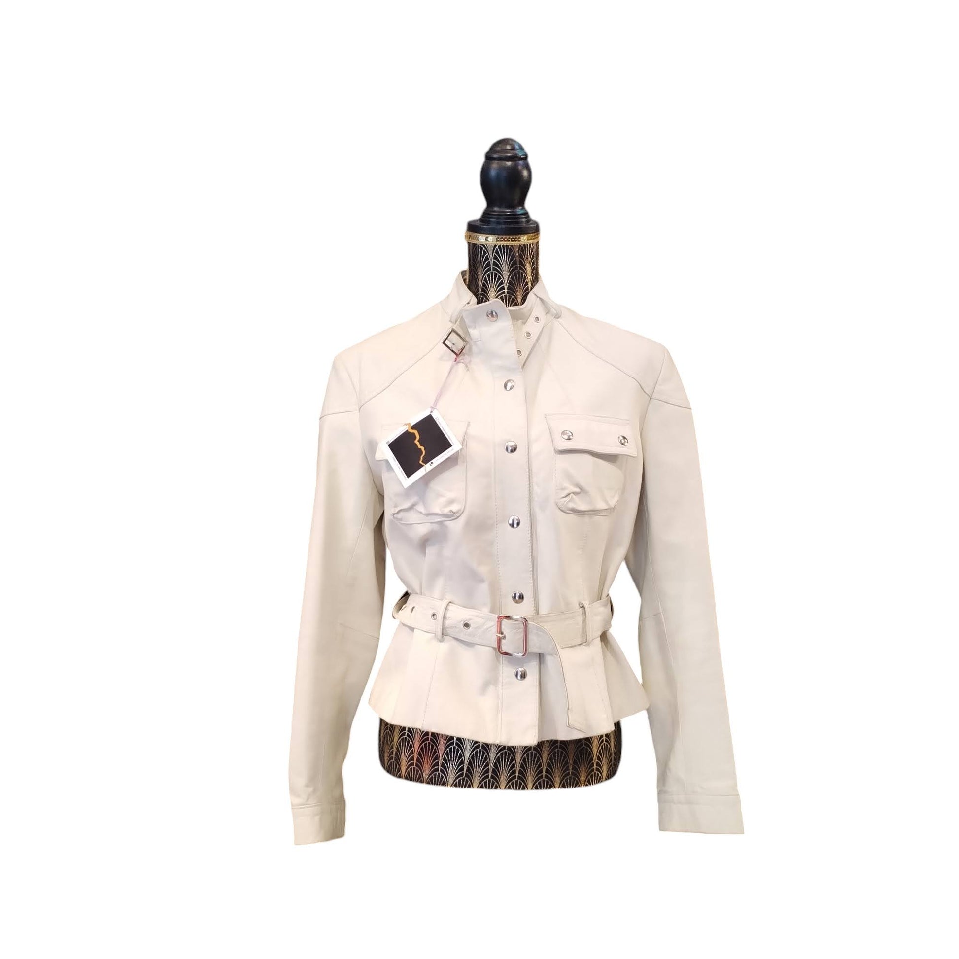 Immagina una giacca di pelle che sfida le convenzioni. Non è il classico nero lucido, ma un candido guscio di pelle che avvolge il corpo con morbida determinazione. Questa giacca, taglia 46, è un pezzo unico nel suo genere, un connubio audace tra il classico e l'avanguardista.