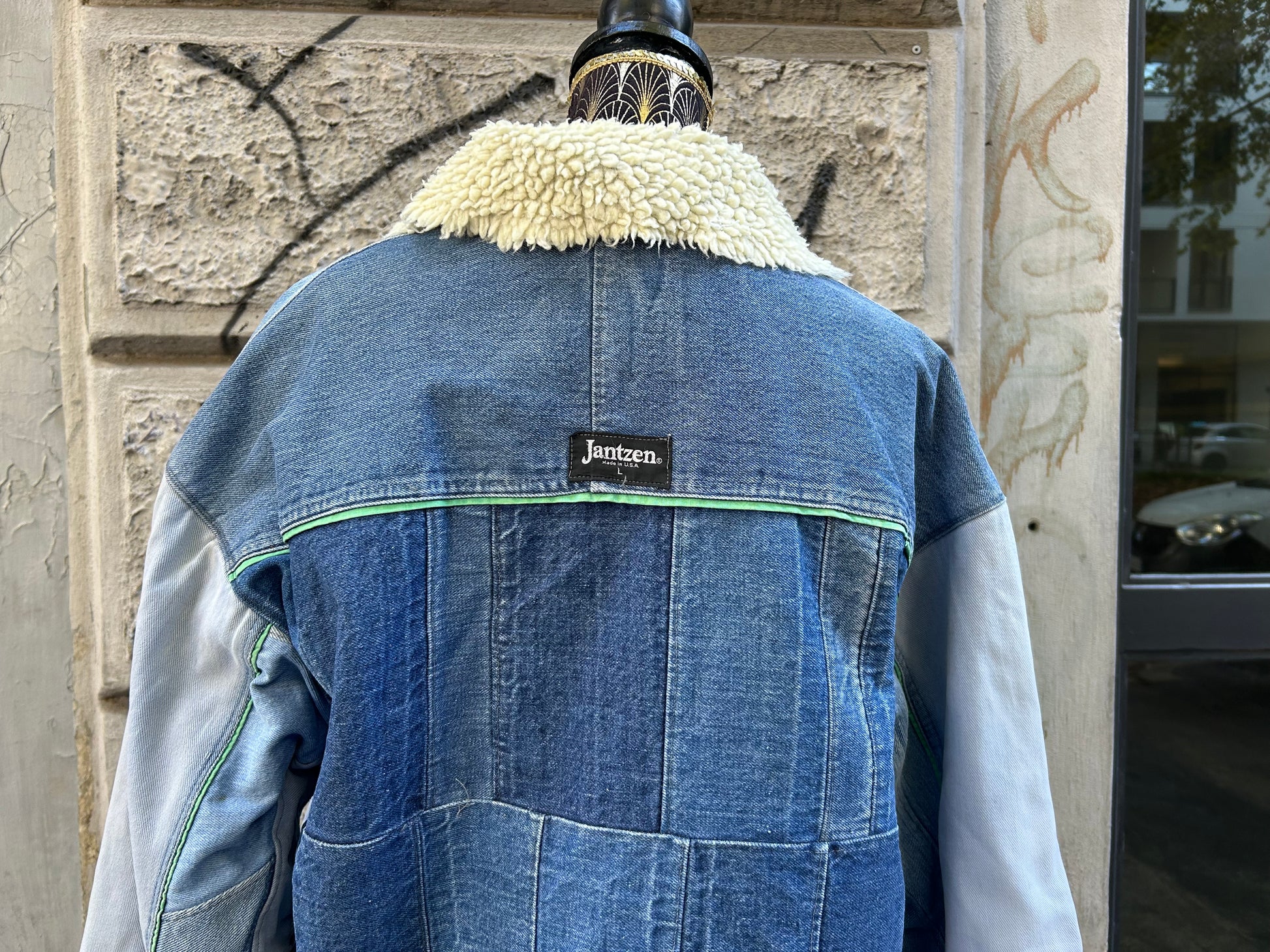 Realizzata con un Patchwork di denim, imbottita con lana sherpa.