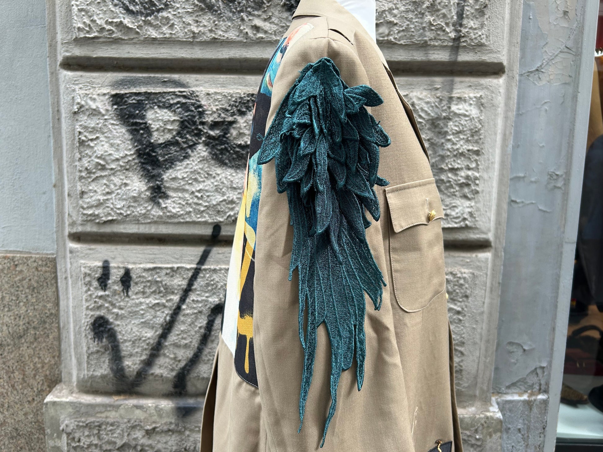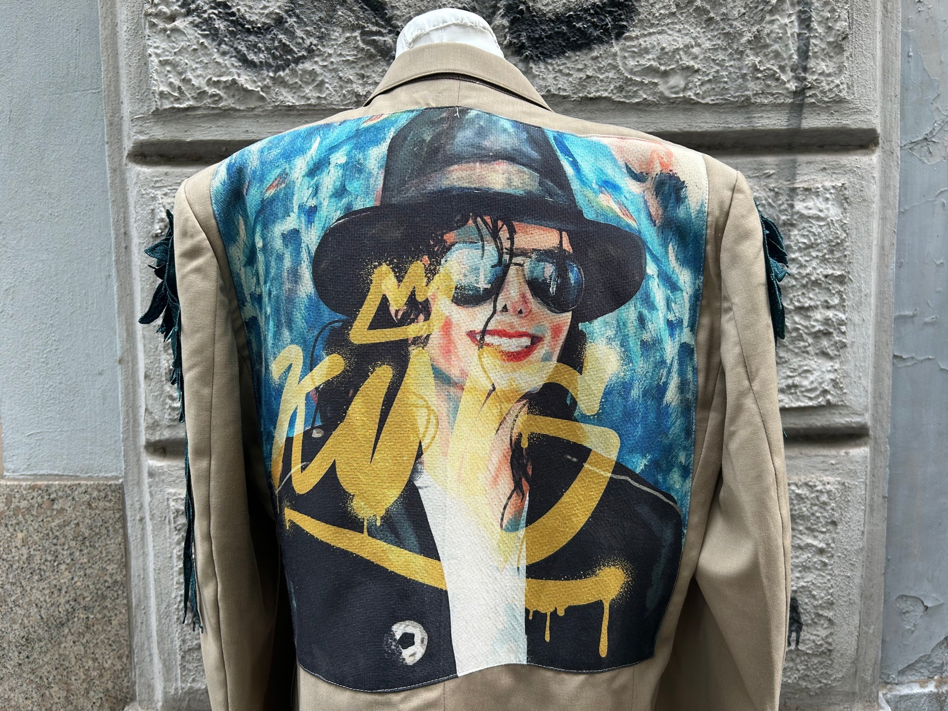 Abbiamo scelto di renderla meno rigorosa,applicando una passamaneria color ottanio sulle spalle e un canvas a tema Michael Jackson dietro alla schiena.