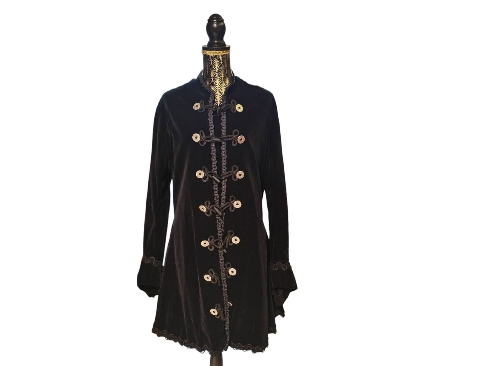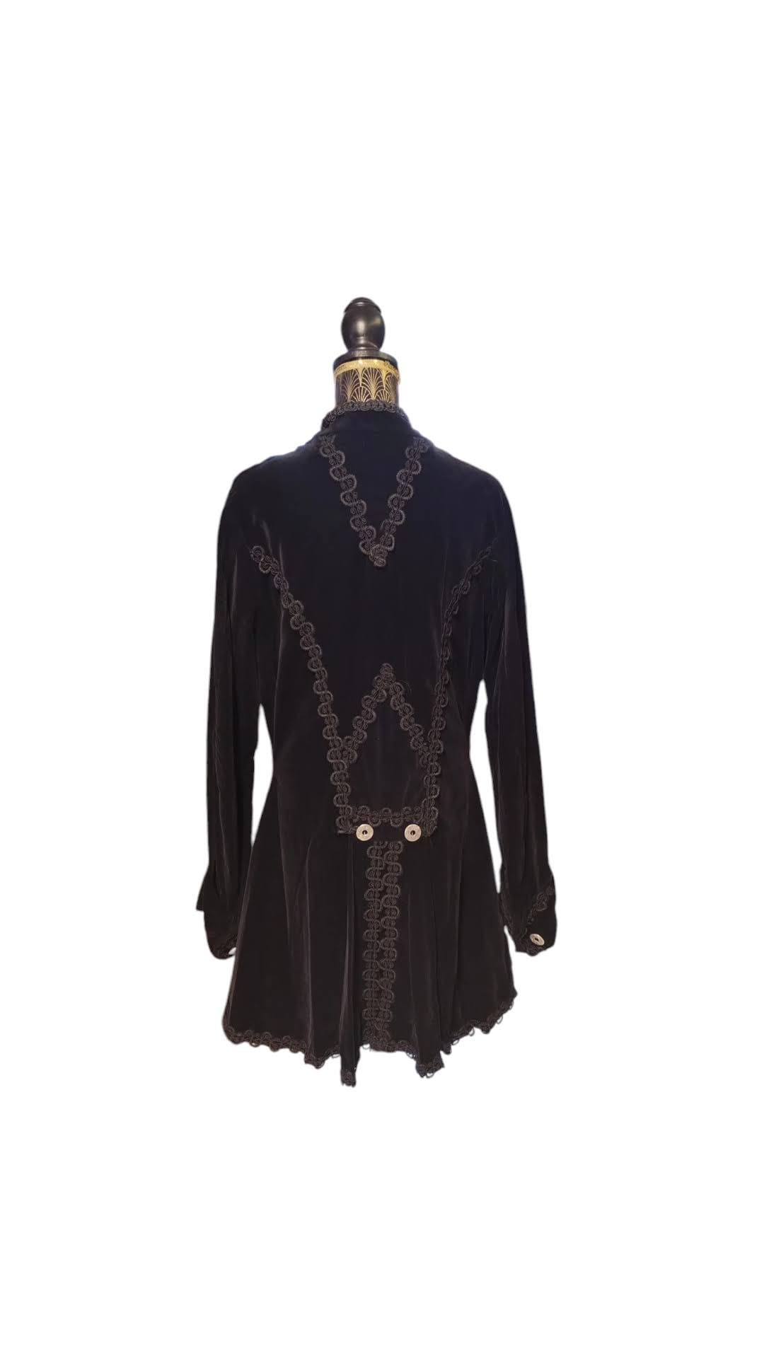 Un capospalla che cattura lo sguardo e l'anima, un capo vintage in velluto che racconta storie di epoche passate e di un'eleganza dark e sofisticata. Questa giacca gotica è un vero e proprio gioiello, un capo che non passerà inosservato.