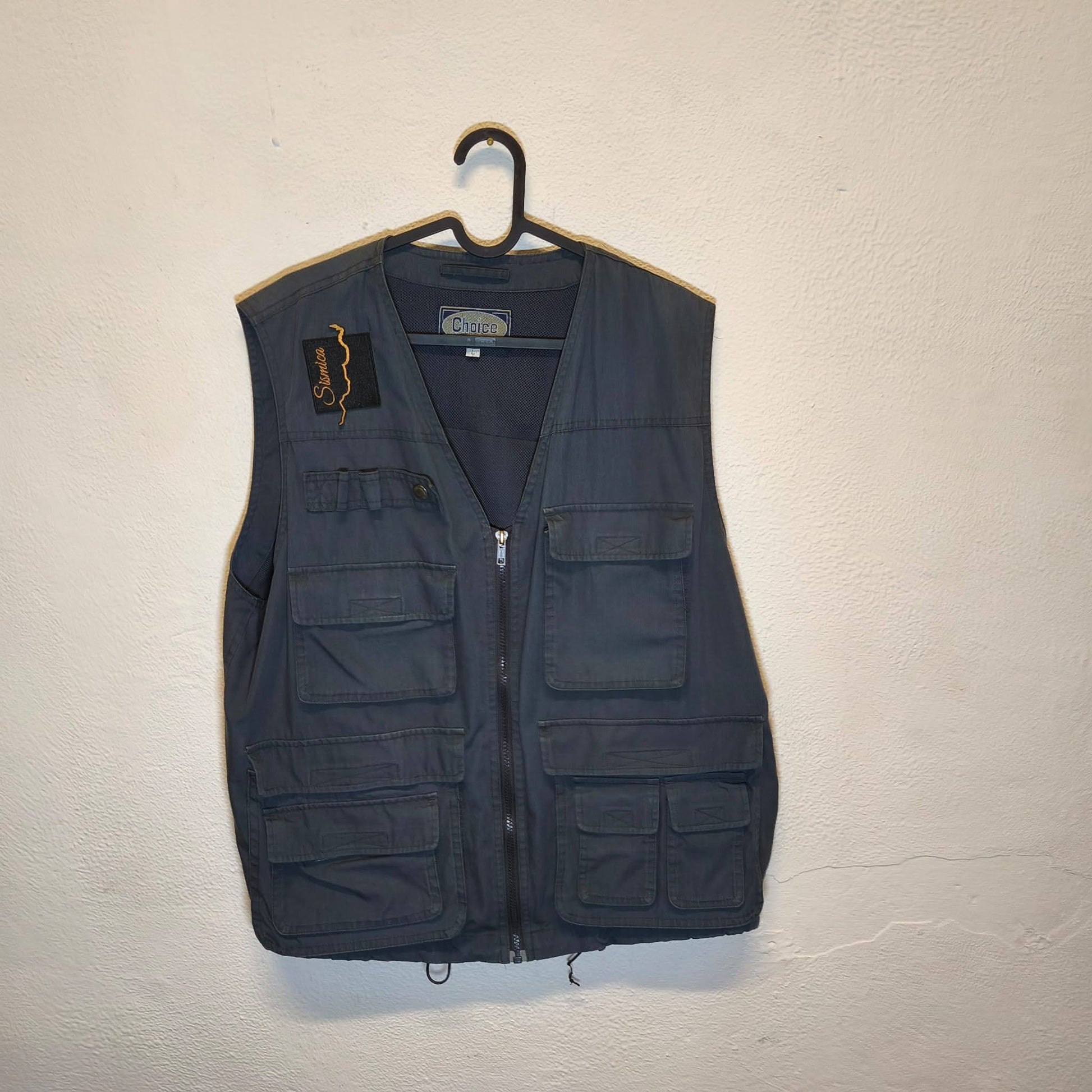 Un gilet vintage blu modello pescatore, senza maniche realizzata in leggero cotone blu,impreziosita da un quadrato di stoffa recuperato dalla fodera di un cuscino a tema pin up.