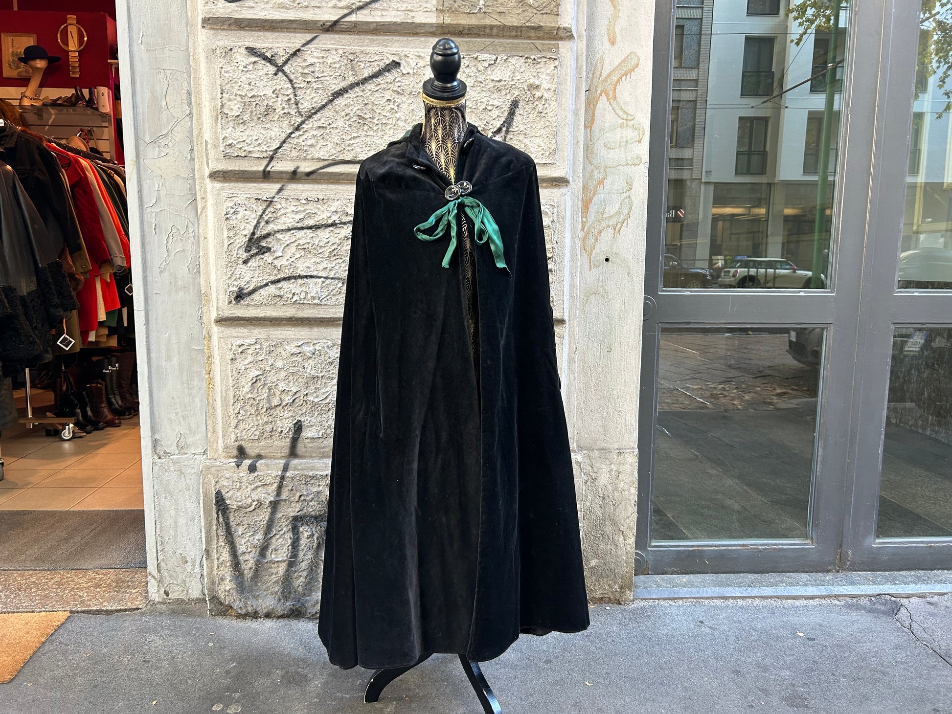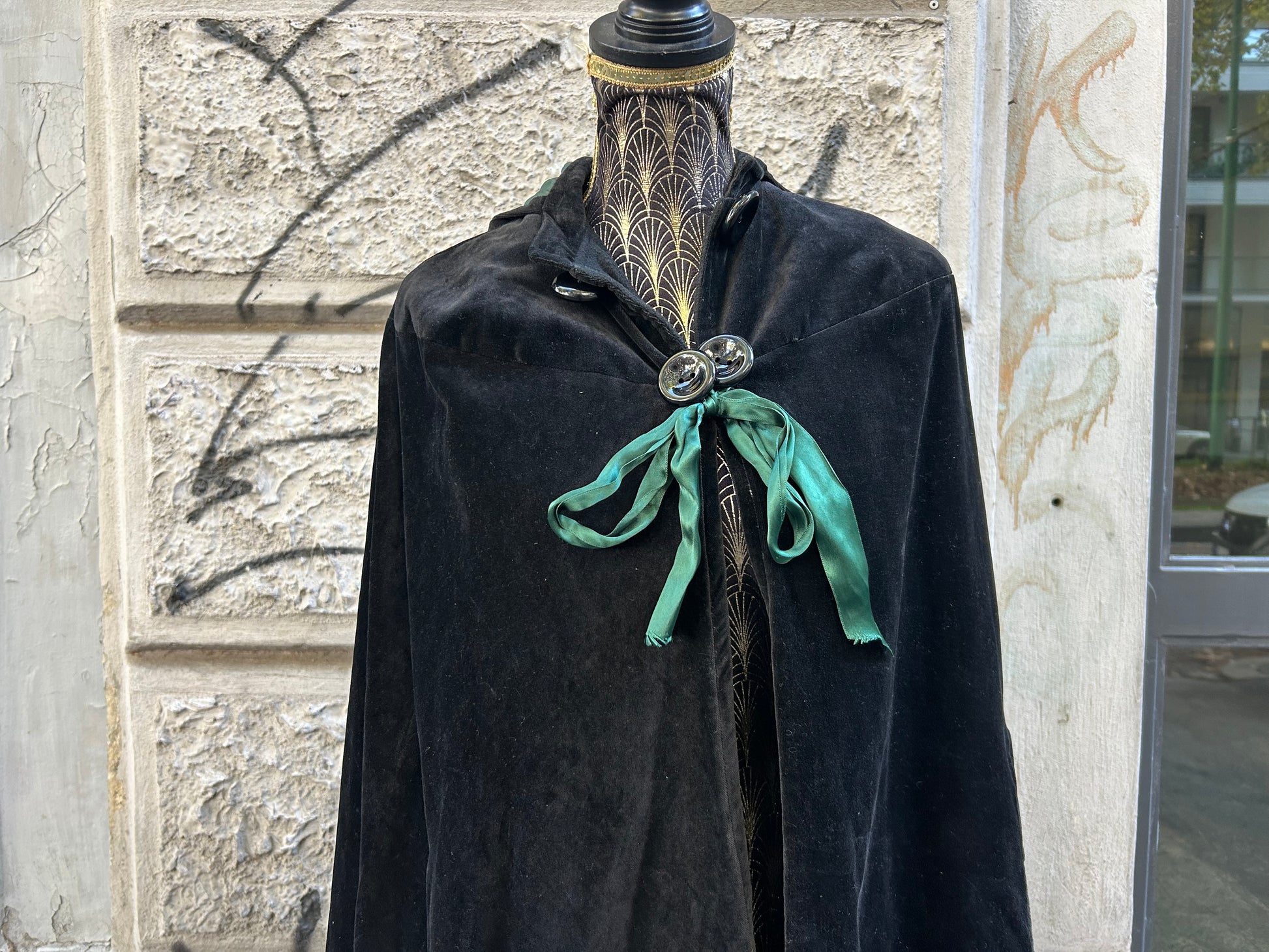 Mantella lunga teatrale vintage in velluto verde