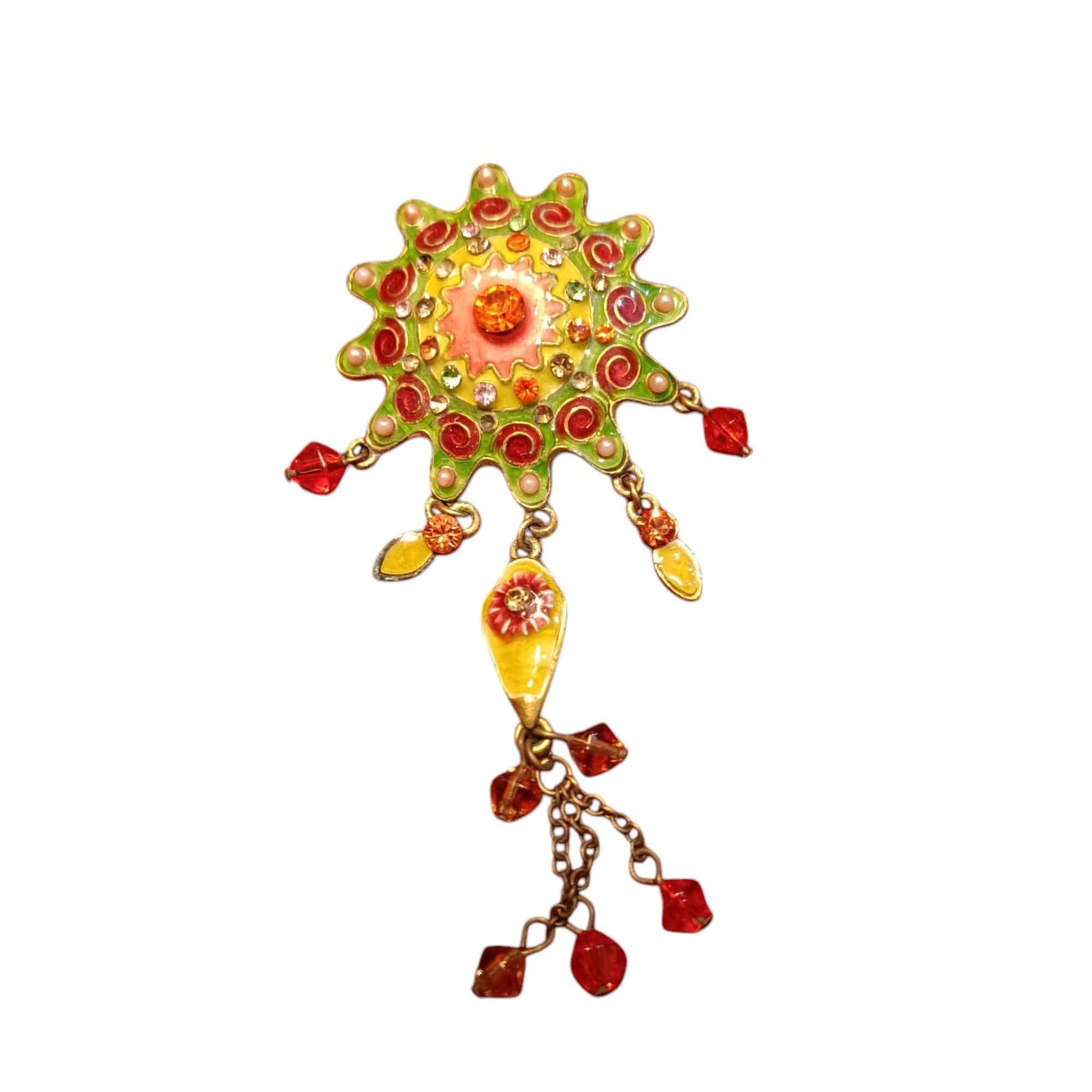 Spilla raffigurante un sole stilizzato con pietre naturali e smaltata sui toni del verde e del rosa.