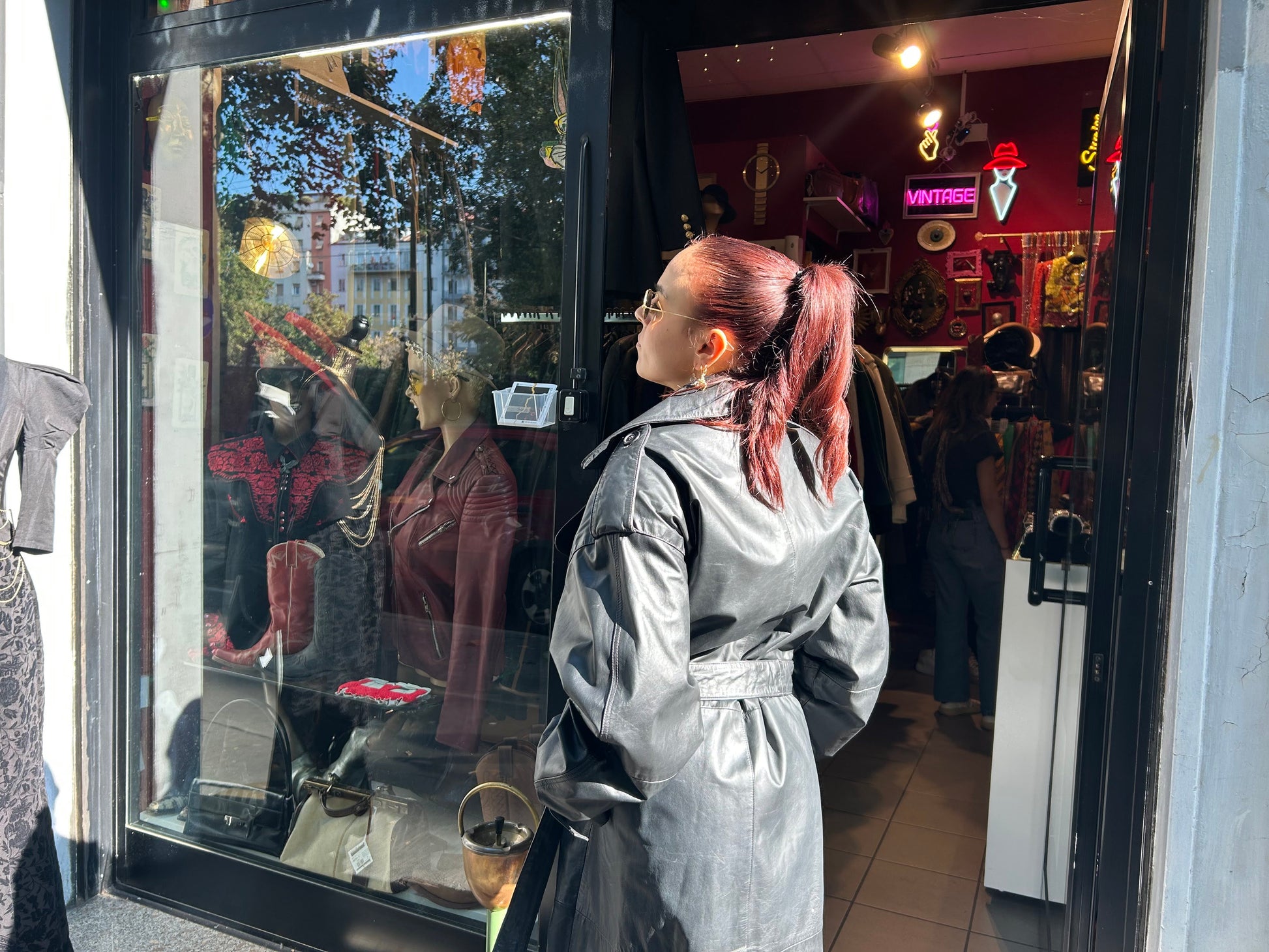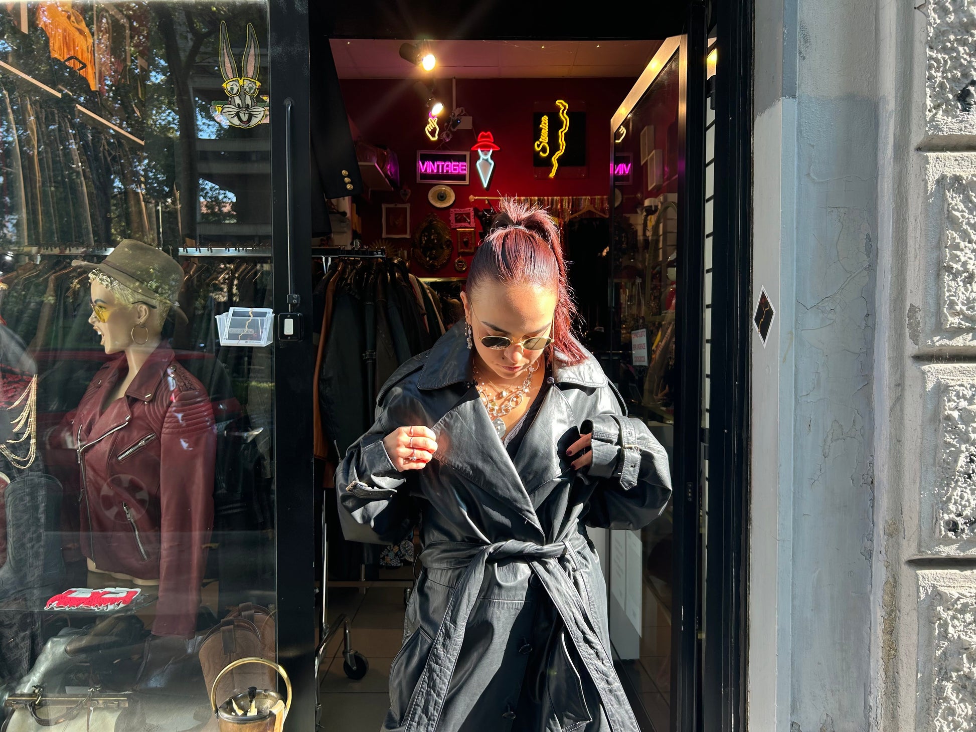 Trench vintage over in pelle nera,lungo alla caviglia con cintura in vita.